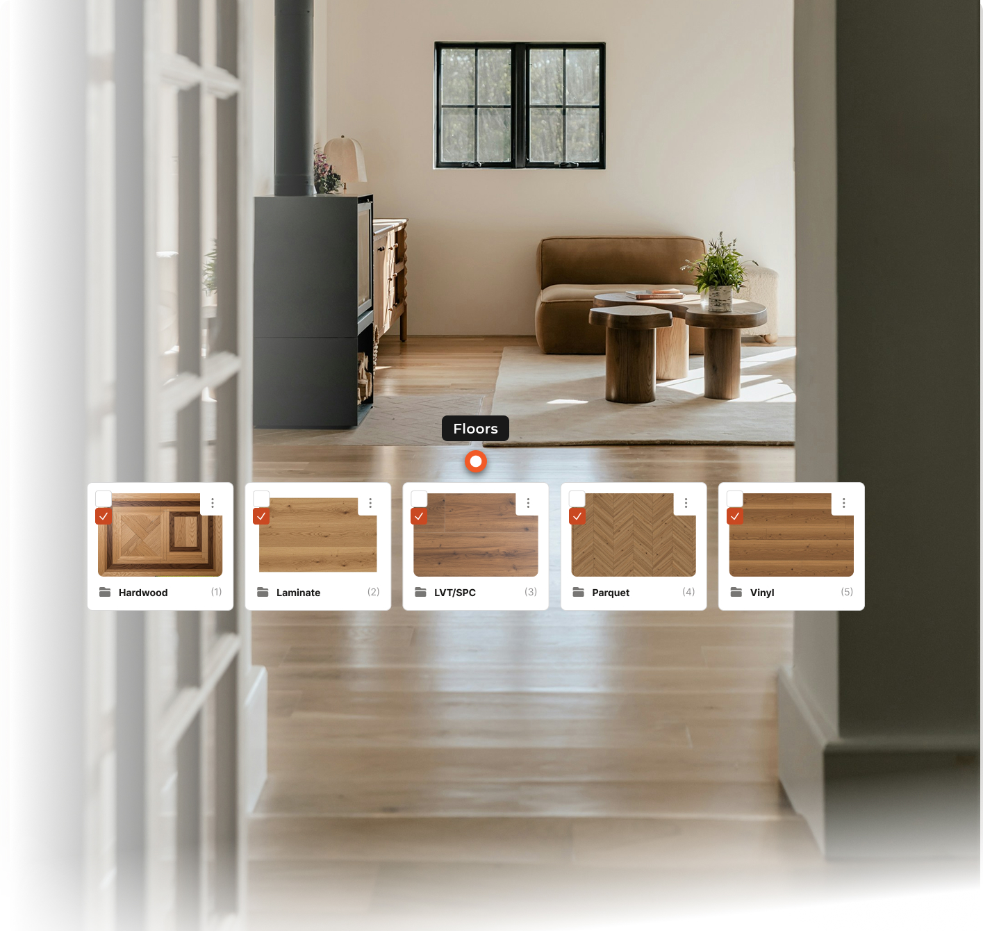 From engineered wood to vinyl, parquet, and LVT/SPC – Floori gives you the tools to digitize products, manage catalogs, and let customers preview floors in real spaces.